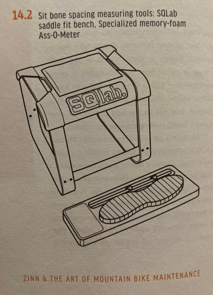 Specialized saddle dealers have devices for measuring for sit-bone width: either a small memory-foam one (Fig. 1, bottom, lovingly called an Ass-O-Meter) or a digital pressure-sensitive screen (the Digital Sitbone Device, or DSD). The rider sits on the device on a low bench with the knees higher than the hips to press their ischial tuberosities into the memory foam or the pressure-sensitive screen. The distance between the centers of these impressions is the sit bone width.
