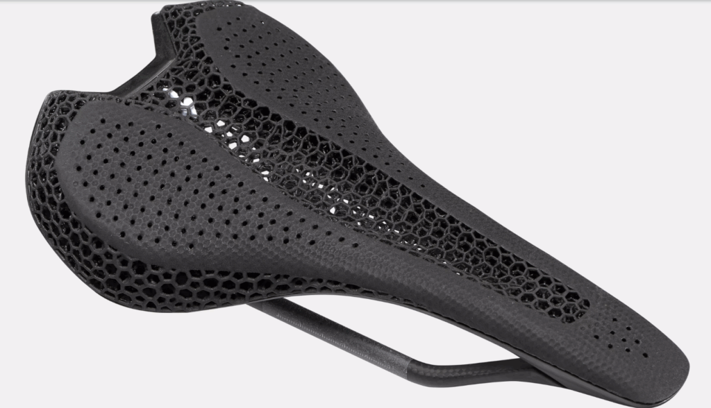 Most Specialized Mirror saddle models, which are 3D-printed in an open matrix intended to “mirror” the rider’s physiology (Fig. 6), also have this MIMIC hammock-like central feature, but as a stretchy, open honeycomb.
