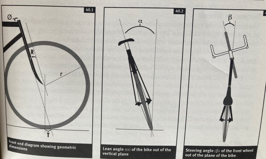 The middle illustration shows the lean angle ⍺, and the illustration on the right shows the steering angle, β. The bigger ⍺ is, the bigger β must be to correct the lean by getting the wheel back under the bike so it will stand back up again.