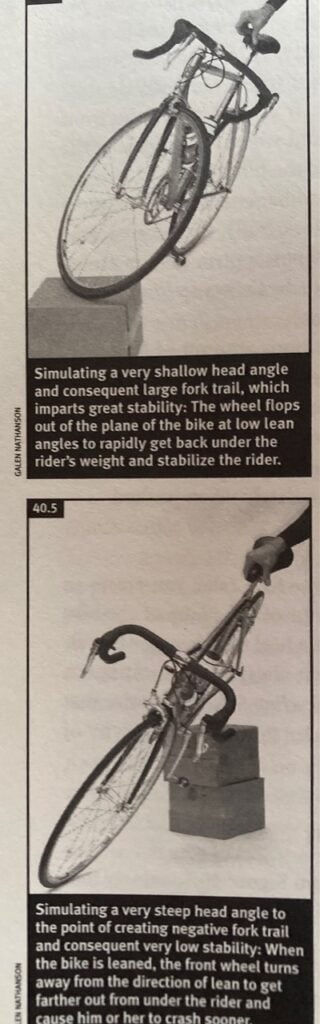 You can demonstrate how decreasing the head angle will increase fork trail and stability and get insight into wheel flop at the same time. To simulate this with any bike, stack boxes under its front wheel (see top photo from that same book of mine). If you now lean the bike, you will see that the front wheel flops over into the turn to a much sharper angle than when it was flat on the floor, thus enabling the wheel contact patch to get back under the rider’s center of gravity more quickly.