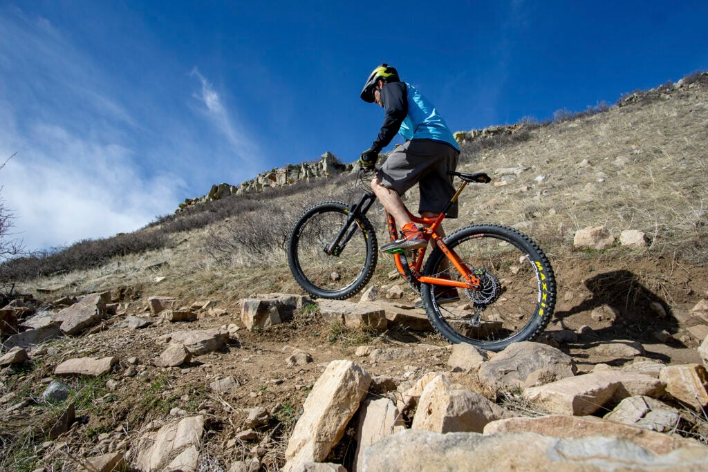 If you put 27.5” or 26” wheels on the 29er trail bike, it would hold a line better while climbing; problem is, the rider would probably also hit the pedals on rocks. Substituting a suspension fork of the same length but with 51mm of offset (rake) rather than 44mm would decrease the bike’s fork trail from 121mm to 113mm and its wheel flop factor from 46mm to 43mm.