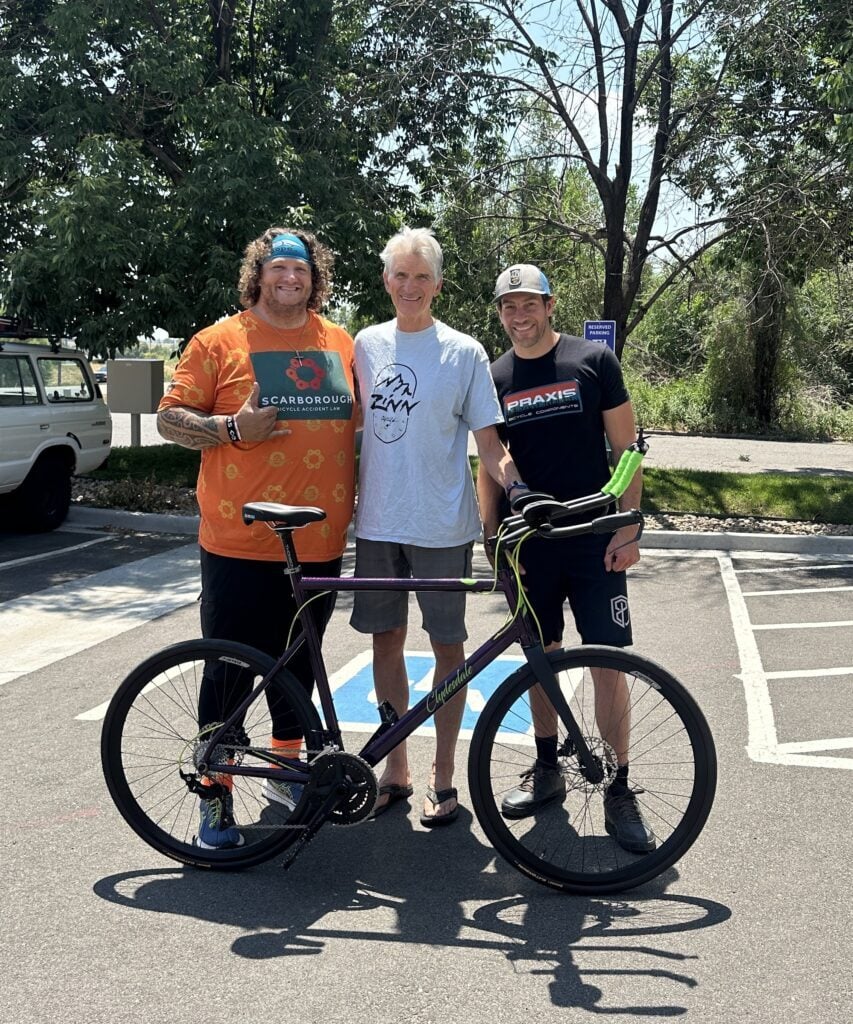 CT Wike, Lennard Zinn and Nick Wigston in front of Zinn Cycles in Colorado