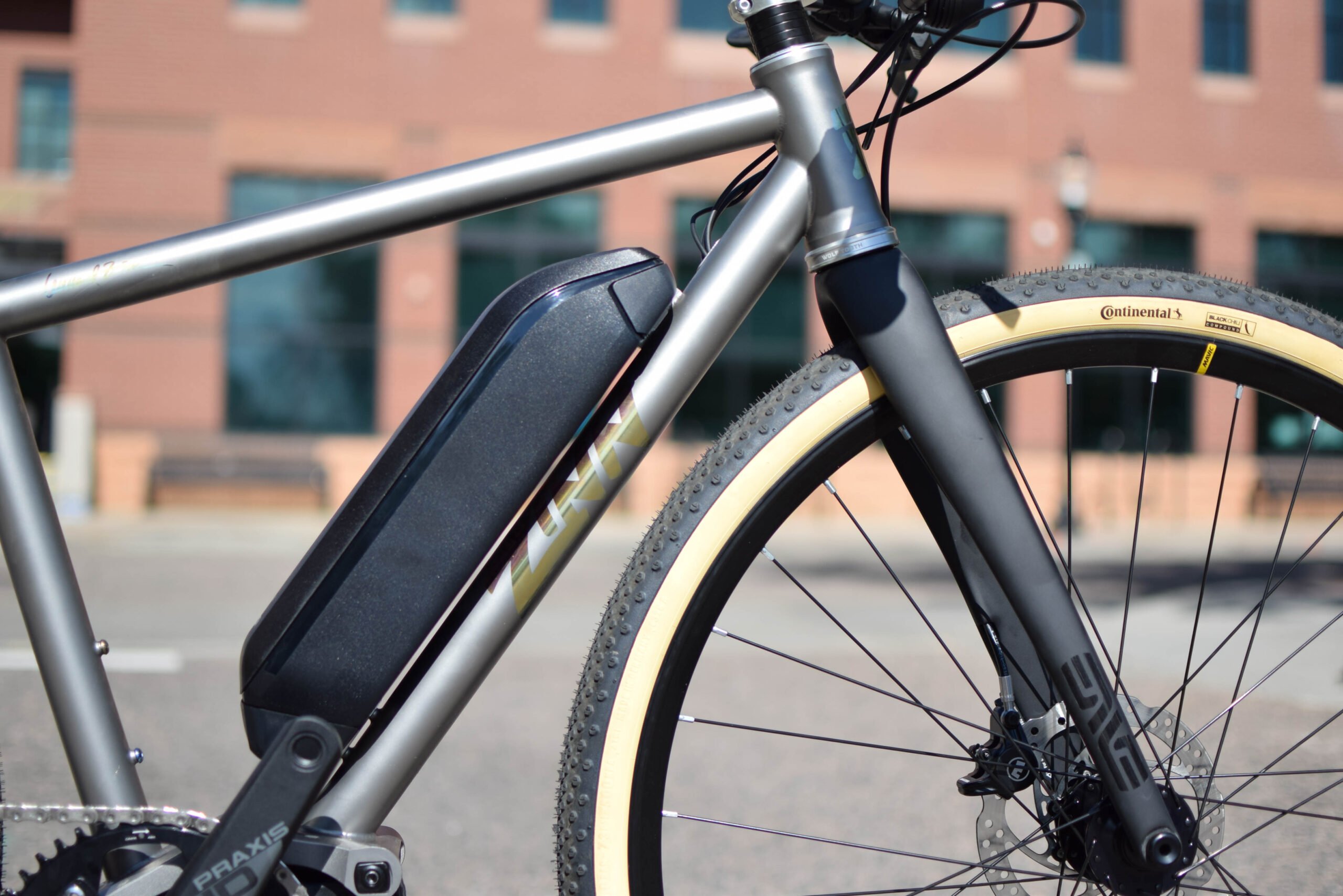 This custom titanium e-bike is built as a peformance flat bar all road bike. She came into our shop for a bike fitting with Lennard where he set her up on our Guru fit cycle and found the perfect riding position. Then he designed the bike to meet those precise measurements.
