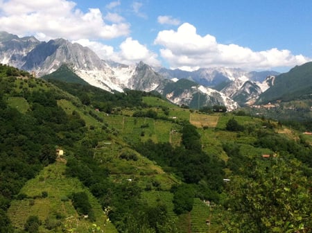 The ride was pretty flat for about 30k, then the climb began. Firs gentle 4-8% (that's gentle now), then it kicked up to 10 -15% for about 4k. It let up a little going through some towns. But the climb to the last town was steady over1 2% for 1.5k. Well, at. The turn for the town (which is a dead end on a point, I saw the sign for the "cave", the marble mine. There's actually several, but I think the approaches are all the same. So, there I was climbing 20% switchbacks, about 30-40 meters each. I made it half way up the 4th, really feeling it, when two mining trucks came, one up, behind me, and one down. I pulled into the flowers on the right and stopped , watching the trucks pass each other in a dance they must repeat all day long. The concierge told me that when they get to the top turns, there's no room to even turn one truck so they have a place at each turn where they go into and then go up backwards, repeating this until they reach the mine. I was slightly above my destination town (see photo), and I turn and went down, but couldn't resist going up to the town, which felt "easy" now at 6-10%. And there was a great fountain at the top! ( see photo ). So these are the white topped mountains I've been seeing froths distance all week if it were snow, you'll need to bring your rock skis. home was supposed to be all downhill then a long 20k flat run home, avoiding the beach traffic. What the guide book said was when you get to the STOP sign at the bottom of the hill, in Carrara, make a left turn toward Massa. What the guide book didn't say was as you approach the bottom get into a low gear, because when you make that left, from a full stop, your facing a 500 meter 8% uphill climb, before you reach that flat section. Oy. The ride back to Viareggio on the alternate route was busy with traffic anyway. When I got to town, I immediately went to my new favorite Gelateria, for a dark chocolate mixed with dark cherry, and another wonderful flor that I haven't identified yet. I'll ask tomorrow. I cleaned and lube Sally for another ride tomorrow. Dinner at a grey restaurant. Chef's choice, fixed price meal. Just what I was craving. Lots of fish. Pasta vongole, with clams and lots of mussels. And a mixed grilled fish and vegetables dish. I'm full, and I only had one piece of bread. Oh, and a carafe of very good house wine. I feel full, and I feel fine.